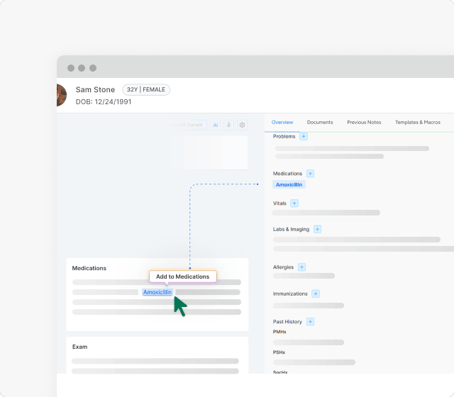 Allow providers to summarize their interactions with patients, and Darwin AI will convert these summaries into structured clinical notes. This feature in our EHR software eliminates the need to navigate through different sections or worry about precise wording and dictation errors.