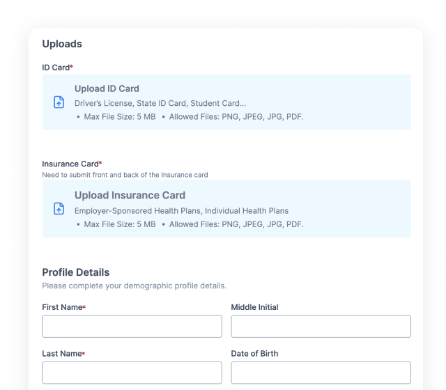 Provide patients with an easy-fill user interface that simplifies the completion and submission of forms, along with the upload of necessary documents. This system enhances efficiency and ensures all required information is received before the visit.