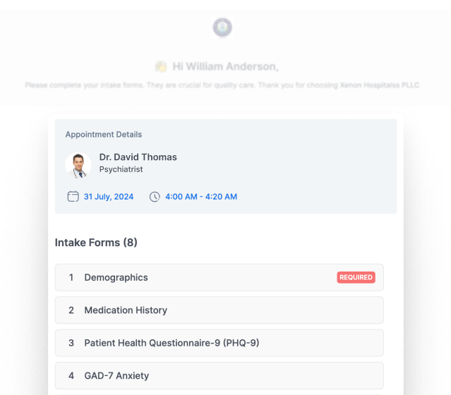 Streamline your practice by effortlessly creating and customizing intake forms for any specialty and attaching them to specific visit types. These forms are automatically sent via SMS and email when appointments are booked, ensuring efficient pre-visit preparation and precise management of patient intake.